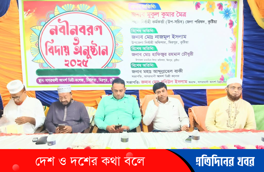 সেই পরিক্রমায় সাগর খালি আদর্শ ডিগ্রী কলেজে নতুন ভর্তি কৃত ছাত্র-ছাত্রীদের বরণ ও ২০২৫ সালের এইচএসসি পরীক্ষার্থীদের বিদায় অনুষ্ঠানে কলেজের অধ্যক্ষ রবিউল ইসলামের সভাপতিত্বে প্রধান অতিথি হিসেবে উপস্থিত ছিলেন কুষ্টিয়া জেলা পরিষদের প্রধান নির্বাহী কর্মকর্তা (উপ-সচিব) মুকুল কুমার মৈত্র, বিশেষ অতিথি হিসেবে উপস্হিত ছিলেন মিরপুর উপজেলা নিবার্হী অফিসা নাজমুল ইসলাম, সাগরখালী আদর্শ ডিগ্রী কলেজের সভাপতি আব্দুল্লাহেল বাকী সহ কলেজের শিক্ষক অভিভাবকসহ স্থানীয় ব্যক্তিবর্গ।