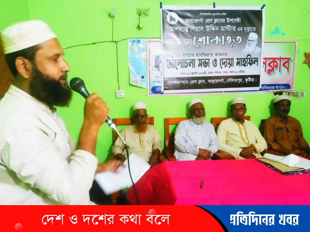 দৌলতপুর প্রতিনিধিঃ মিলন আলী কুষ্টিয়ার দৌলতপুর উপজেলারপুর আল্লারদর্গা প্রেসক্লাবের উপদেষ্টা আলহাজ্ব আল্লারদর্গা প্রেসক্লাবের উপদেষ্টা ও সোনাইকুন্ডি সরকারি প্রাথমিক বিদ্যালয়ের সাবেক প্রতিষ্ঠাতা প্রধান শিক্ষক, আলহাজ্ব গিয়াস উদ্দিন মাস্টারের ইন্তেকালে গভীর শোক প্রকাশ করেছে আল্লারদর্গা প্রেসক্লাব। তাঁর আত্মার মাগফিরাত কামনায় প্রেসক্লাব প্রাঙ্গণে এক আলোচনা সভা ও দোয়া মাহফিল অনুষ্ঠিত হয়। এতে প্রেসক্লাবের সদস্যরা ছাড়াও এলাকার গণ্যমান্য ব্যক্তিবর্গ অংশগ্রহণ করেন। ১২ জুলাই শনিবার সকাল ১০ টায় প্রেসক্লাবের অফিস কক্ষে এই দোয়া মাহফিল অনুষ্ঠিত হয়। প্রেসক্লাবের সভাপতি ও দৈনিক বাংলাদেশ বার্তা প্রতিনিধি খন্দকার জালাল উদ্দীনের সভাপতিত্বে ও সদস্য নাজমুস সাদাত খানের সঞ্চালনায় বক্তব্য রাখেন প্রেসক্লাবের সাধারণ সম্পাদক ও দৈনিক জনকণ্ঠ প্রতিনিধি সাইদুল আনাম, যুগ্ম সাধারণ সম্পাদক সেলিম রেজা,কোষাধ্যক্ষ আশিক ইসলাম, তথ্য ও গবেষণা সম্পাদক নসিব উদ্দিন,সদস্য জহুরুল ইসলাম, শাহাবুল মাহমুদ সহ অন্যান্যরা। আলোচনায় বক্তারা মরহুম গিয়াস উদ্দিন মাস্টারের শিক্ষা ও সমাজসেবায় অবদানের কথা গভীর শ্রদ্ধার সঙ্গে স্মরণ করেন। আল্লাহ যেন তাঁকে জান্নাতুল ফেরদৌস নসীব করেন—এমন প্রার্থনায় শেষ হয় দোয়া মাহফিল।