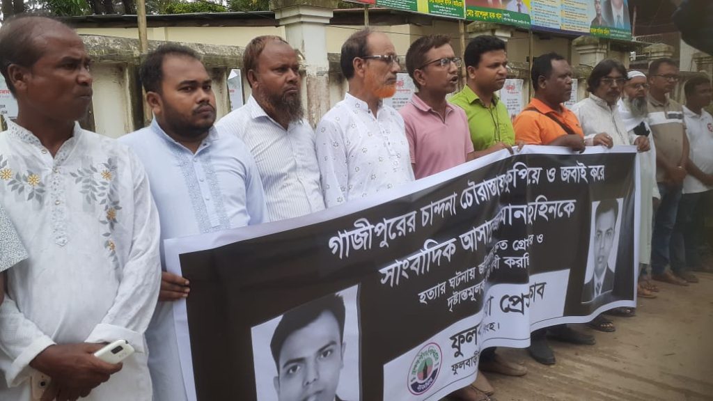 গাজিপুরের চান্দীনা চৌরাস্তায় কুপিয়ে ও জবাই করে সাংবাদিক আসাদুজ্জামান তুহিনকে হত্যার ঘটনায় জড়িতদের দ্রুত গ্রেফতার ও দষ্টান্তমুলক শাস্তির দাবীতে ফুলবাড়ীয়া উপজেলা পরিষদের  সামনে মানববন্ধন করেছে  ফুলবাড়ীয়া প্রেসক্লাবের  সাংকাদিকবৃন্দ।