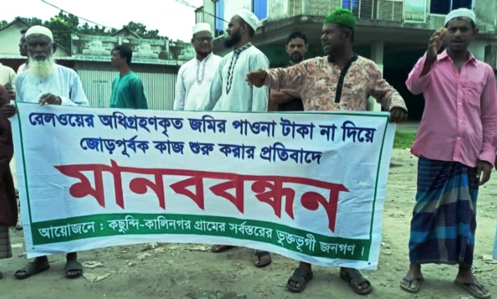 রেলওয়ের অধিগ্রহণকৃত জমির মূল্য পরিশোধ না করেই জোরপূর্বক নির্মাণকাজ শুরু করার অভিযোগে মানববন্ধন করেছেন মাগুরার কছুন্দি ও কালিনগর গ্রামের শতাধিক ক্ষতিগ্রস্ত মানুষ। শুক্রবার ( ৮ জুলাই) জুমার নামাজের পর মাগুরা-ঢাকা মহাসড়কের ওয়াবদা বাজার এলাকায় ঘণ্টাব্যাপী এ মানববন্ধন অনুষ্ঠিত হয়।