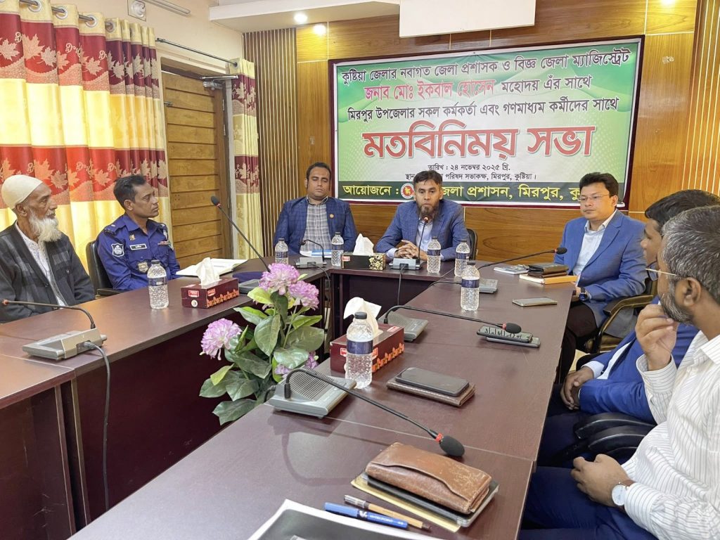 কুষ্টিয়ার মিরপুরে উপজেলার প্রশাসন ও গণমাধ্যম কর্মীদের সাথে মতবিনিময় করেছেন নবাগত জেলা প্রশাসক মোঃ ইকবাল হোসেন। সোমবার সকাল সাড়ে ১০টায় উপজেলা সম্মেলন কক্ষে উপজেলা প্রশাসনের আয়োজনে এ মতবিনিময় সভা অনুষ্ঠিত হয়। মতবিনিময় সভায় জেলা প্রশাসক মো. ইকবাল হোসেন তাঁর বক্তব্যে বলেন, আমি আপনাদের আশ্বস্ত করতে চাই আমি যতদিন এখানে থাকবো, আমি কিছু নিতে আসিনি। আমি এখানে এসেছি নির্মোহভাবে কাজ করতে। এটা সম্পূর্ণ সত্য কথা। এই সামান্য পৃথিবীতে টাকা-পয়সা আমাকে টানে না। আমি যেদিন যাবো, আমার কাজের মাধ্যমেই আমাকে মিলিয়ে নেবেন।