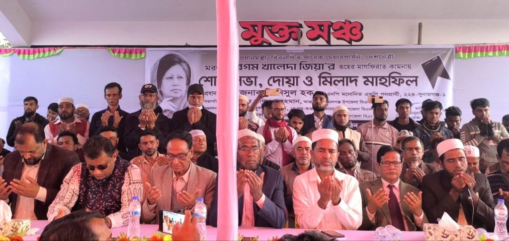 সাবেক প্রধানমন্ত্রী, দেশনেত্রী বেগম খালেদা জিয়ার রুহের মাগফিরাত কামনায় জামালগঞ্জে মিলাদ ও দোয়া মাহফিল অনুষ্ঠিত হয়েছে। শনিবার বিকালে উপজেলা হ্যালিপেড মাঠে এ মিলাদ ও দোয়া মাহফিল হয়। জামালগঞ্জ উপজেলা বিএনপি
