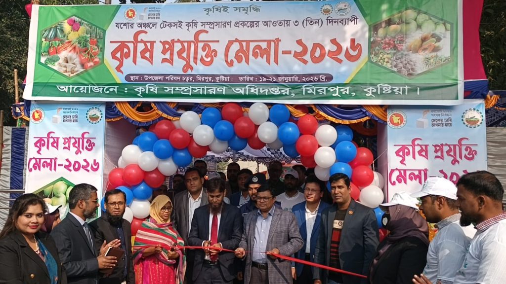 কুষ্টিয়ার মিরপুরে উপজেলা কৃষি সম্প্রসারণ অধিদপ্তরের আয়োজনে এবং যশোর অঞ্চলে টেকসই কৃষি সম্প্রসারণ প্রকল্পের আওতায় তিন দিনব্যাপী কৃষি প্রযুক্তি মেলা ২০২৬-এর শুভ উদ্বোধন অনুষ্ঠিত হয়েছে।