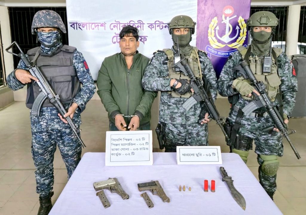 চট্টগ্রাম, দেশব্যাপী সার্বিক নিরাপত্তা ব্যবস্থা জোরদারকরণ এবং আসন্ন ত্রয়োদশ জাতীয় সংসদ নির্বাচনকে সামনে রেখে অপরাধমূলক কার্যক্রম প্রতিরোধ ও আইন-শৃঙ্খলা পরিস্থিতি সমুন্নত রাখার লক্ষ্যে দায়িত্বপ্রাপ্ত এলাকাসমূহে বাংলাদেশ নৌবাহিনী নিরবচ্ছিন্নভাবে অভিযান ও টহল কার্যক্রম চালিয়ে যাচ্ছে। এরই ধারাবাহিকতায় গতকাল রবিবার (১৮-০১-২০২৬) দিবাগত রাতে টেকনাফ উপজেলার নাজিড়পাড়া এলাকায় নৌবাহিনী অভিযান পরিচালনা করে আগ্নেয়াস্ত্র ও গোলাবারুদসহ একাধিক মামলার ওয়ারেন্টভুক্ত আসামি শামশুল হক ওরুফে বদাফুলাকে আটক করে। টেকনাফে মোতায়েনকৃত নৌবাহিনী কন্টিনজেন্ট গোপন তথ্যের মাধ্যমে একাধিক মামলার ওয়ারেন্টভুক্ত শীর্ষ সন্ত্রাসী শামশুল হকের অবস্থান জানতে পেরে টেকনাফ উপজেলার নাজিরপাড়া এলাকায় যৌথ অভিযান পরিচালনা করে। এসময় নৌ কন্টিনজেন্ট এবং স্পেশাল ফোর্স (সোয়াডস্) এর অভিযানিক দলটি রাতের অন্ধকারে ধাওয়া করে শীর্ষ সন্ত্রাসী শামশুল হককে আটক করতে সক্ষম হয়। আটককৃত সন্ত্রাসীর তথ্যের ভিত্তিতে তার তরমুজ ক্ষেতের ছাপড়ি ঘর তল্লাাশি করে ০২টি বিদেশি পিস্তল, পিস্তলের ০৩ রাউন্ড তাজা গোলা, শর্টগানের ০২ রাউন্ড তাজা গোলা এবং ০১টি দেশীয় ধারালো অস্ত্র জব্দ করা হয়। থানা সূত্রে জানা যায়, আটককৃত শীর্ষ সন্ত্রাসী শামশুল হক দীর্ঘদিন ধরে মাদক পাচার, মানুষকে জিম্মি করে অর্থ আদায় ও জোর পূবর্ক জমিদখলসহ বিভিন্ন অপরাধমূলক কর্মকাণ্ডের সাথে জড়িত রয়েছে। আটককৃত সন্ত্রাসীর বিরুদ্ধে আইনানুগ ব্যবস্থা গ্রহণের লক্ষ্যে উদ্ধারকৃত অস্ত্র ও গোলাবারুদসহ তাকে স্থানীয় থানায় হস্তান্তর করা হয়। উল্লেখ্য, আটককৃত সন্ত্রাসীর বিরুদ্ধে হত্যা ও অস্ত্র মামলার পাশাপাশি টেকনাফ থানায় একাধিক মামলায় গ্রেফতারি পরোয়ানাও রয়েছে। বর্তমান সরকার ও নির্বাচন কমিশনের নির্দেশনা বাস্তবায়নে আসন্ন ত্রয়োদশ জাতীয় সংসদ নির্বাচনকে সামনে রেখে সমুদ্র ও উপকূলীয় এলাকার নিরাপত্তা নিশ্চিতকরণে বাংলাদেশ নৌবাহিনীর নিয়মিত অভিযান অব্যাহত রয়েছে। পাশাপাশি অভ্যন্তরীণ সন্ত্রাস, মাদক ও অন্যান্য অপরাধমূলক কর্মকাণ্ড প্রতিরোধে নৌবাহিনী সক্রিয় ভূমিকা পালন এবং একটি সুষ্ঠু, সুন্দর ও অবাধ নির্বাচন নিশ্চিত করার লক্ষ্যে ০৮টি জেলার অর্ন্তর্ভুক্ত ১৬টি সংসদীয় আসনে ২৫টি কন্টিনজেন্টে প্রায় ৫ হাজার নৌবাহিনী সদস্য মোতায়েন রয়েছে।