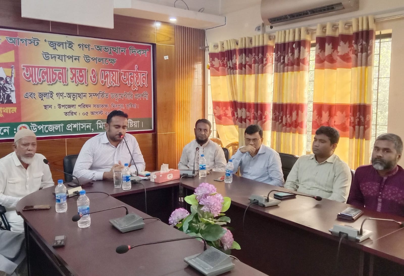 আশিক আলী মিরপুর।। কুষ্টিয়ার মিরপুরে উপজেলা প্রশাসনের আয়োজনে মিরপুরে ৫ আগষ্ট জুলাই গণ-অভ্যুত্থান দিবস উদযাপন উপলক্ষে আলোচনা সভা