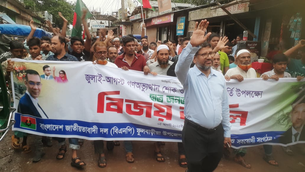 ফুলবাড়ীয়ায় অধ্যক্ষ সিরাজুল ইসলামের নেতৃত্বে জুলাই গণ-অভ্যুত্থানের বিজয় মিছিল